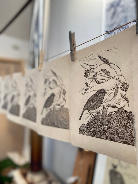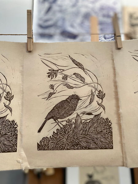 Autumn Winds is a limited edition of 100 prints handprinted onto off white Japanese paper, the print is a smaller print just short of an A4 sheet of paper-This paper is considered to be vegan as there is no sizing agent/wet strengthening agent/aluminium sulphate included in the paper, it is bleached by natural means and is compossed mostly of Gampi fibres, in raw umber ink (also vegan)