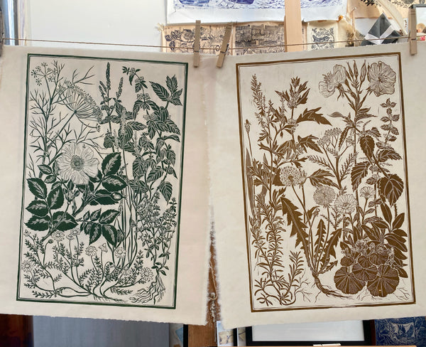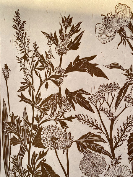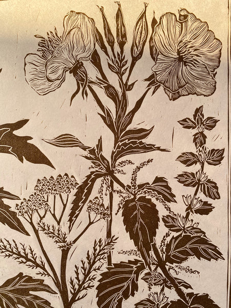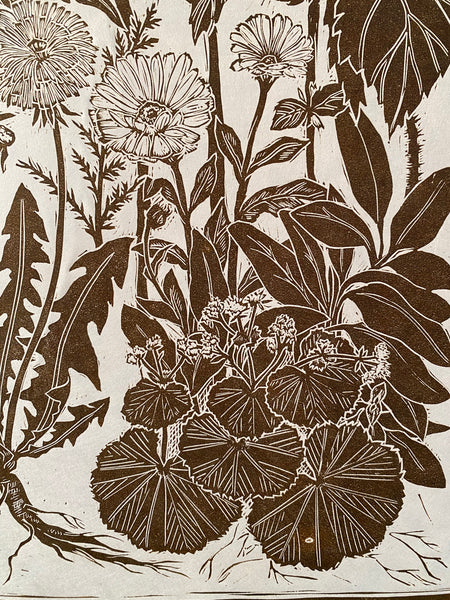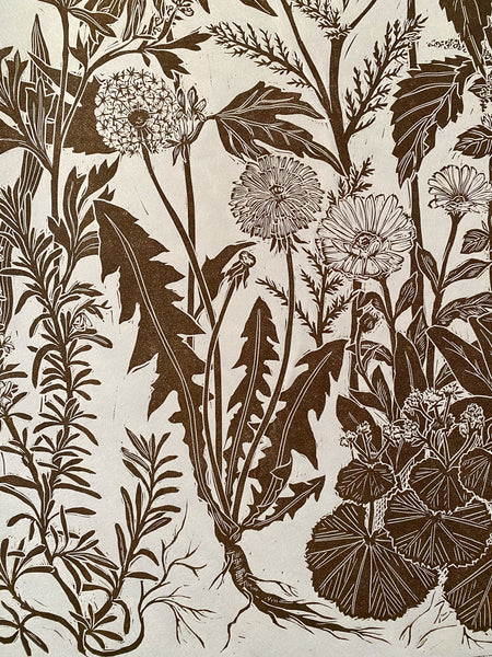 The Medicine Garden is a limited edition of 100 prints handprinted onto off white Japanese paper, the print is a larger print filling the full sheet of paper, block size 31.5cm x 48cm-This paper is considered to be vegan as there is no sizing agent/wet strengthening agent/aluminium sulphate included in the paper, it is bleached by natural means and is compossed mostly of Gampi fibres, in ochre ink (also vegan)