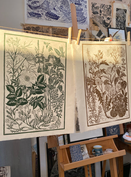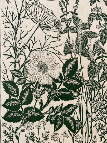 The Tea Garden is a limited edition of 100 prints handprinted onto off white Japanese paper, the print is a larger print filling the full sheet of paper, block size 31.5cm x 48cm-This paper is considered to be vegan as there is no sizing agent/wet strengthening agent/aluminium sulphate included in the paper, it is bleached by natural means and is compossed mostly of Gampi fibres, in deep leaf green ink (also vegan)